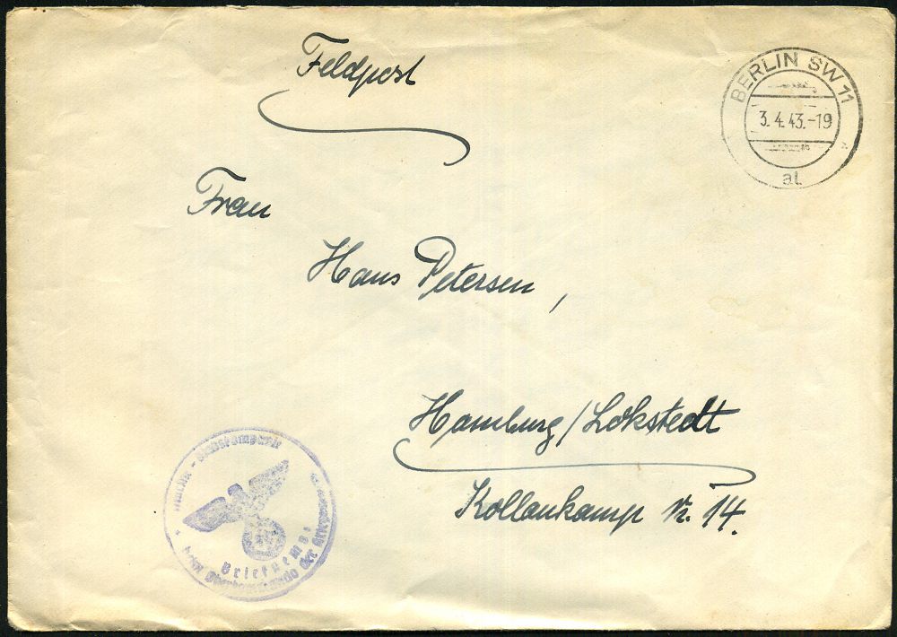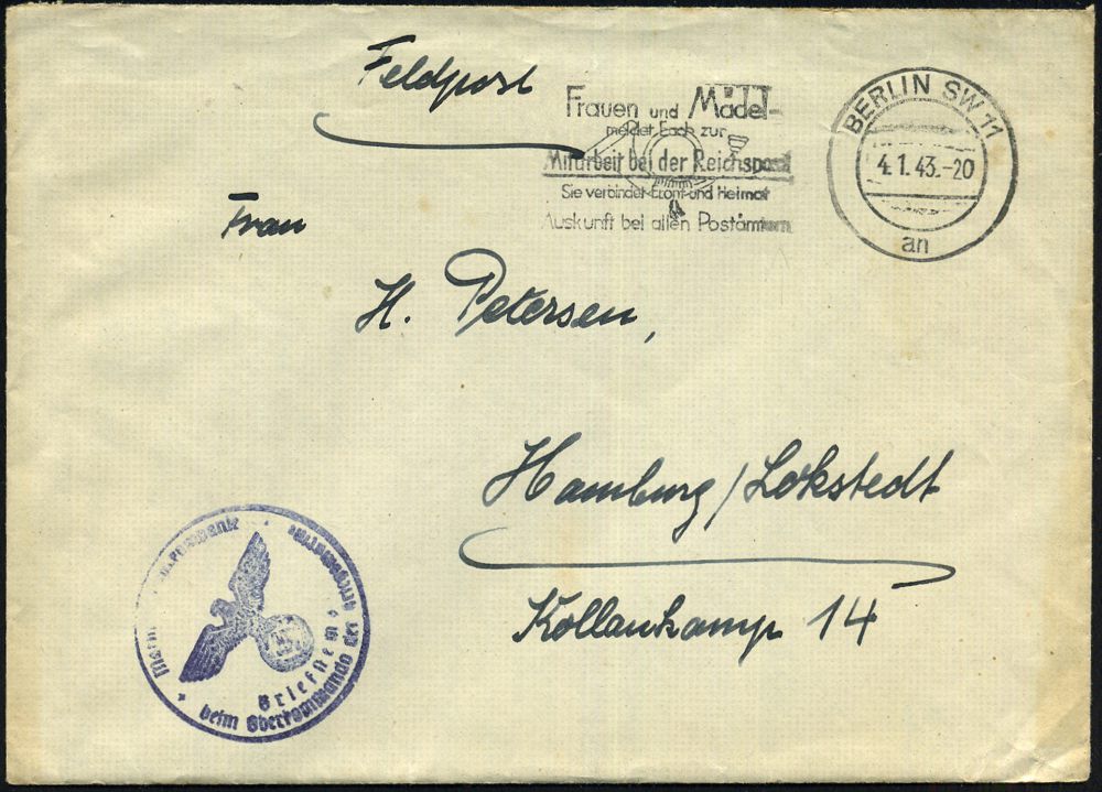 3101 | 20 € | DEUTSCHE KRIEGSMARINE & MARINE-FELDPOST II. WELTKRIEG : BERLIN SW 11 1943 (Jan./Apr.) Serien-MaWSt.: BERLIN SW 11/an/Frauen u. Mädel/ meldet Euch zur/ Mitarbeit bei der Reichspost.. + 2x MaSt. ohne Text, 2x viol. 1K-HdN: Marine-Stabskompanie/beim Oberkommando der Kriegsmarine + 1K-HdN: Marine-Stabskompanie/beim Oberkommando/der Kriegsmarine + je rs. hs. Abs.: "..Berlin-Neukölln.. Musikkorps", 3 Feldpost-Briefe + Inhalt, 3 Belege! (Bo.S 397 A) | ![]() ![]() ![]() ![]() | |
