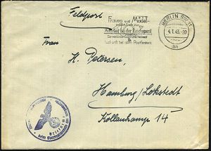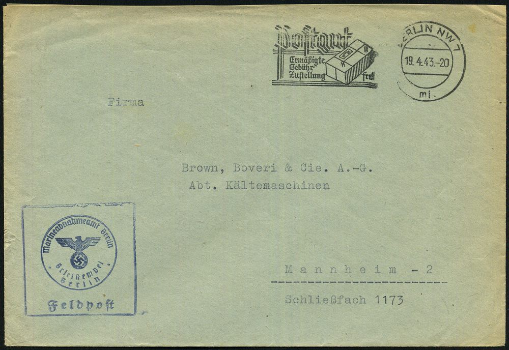 3102 | 12 € | DEUTSCHE KRIEGSMARINE & MARINE-FELDPOST II. WELTKRIEG : BERLIN NW 7/ mi/ Postgut.. 1943 (19.4.) Serien-MWSt + blauer Ra.: Marineabnahmeamt Berlin (aptiert) + rs. Abs.-2L: Marineabnahmeamt Berlin/(Kriegsschiffbau)/Berlin SW 68.., Feldpost-Bf. n. Mannheim (Bo.S 193 A) | ![]() ![]() | |