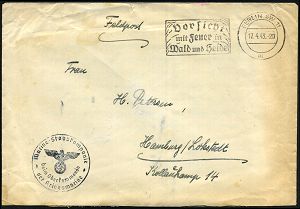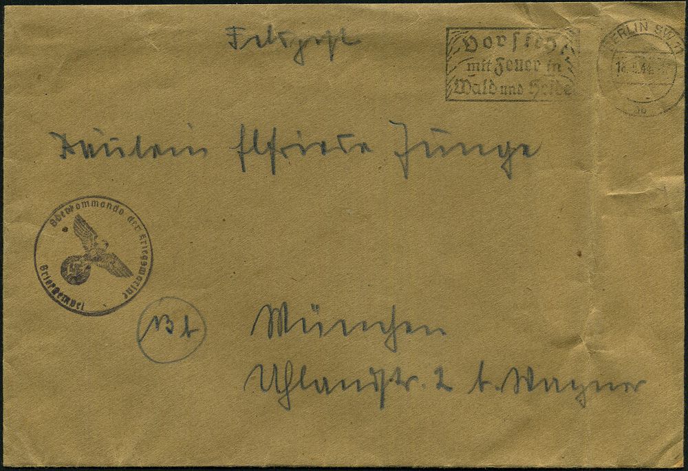 3103 | 14 € | DEUTSCHE KRIEGSMARINE & MARINE-FELDPOST II. WELTKRIEG : BERLIN SW 11/ ab/ Vorsicht/ mit Feuer in/ Wald u.Heide 1944 (16.5.) Serien-MWSt + viol. 1K-HdN: Oberkommando der Kriegsmarine = Großadmiral Erich Raeder (1896 - 1960), Feldpost-Bf. (rechts Falte) + Inhalt n. München (Bp.S 166 A) | ![]() | |