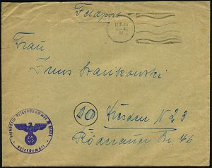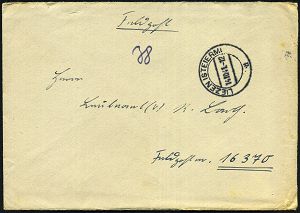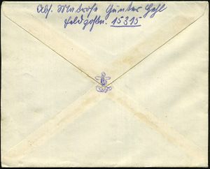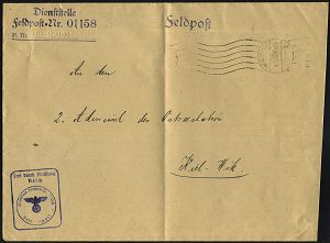 3122 | 15 € | DEUTSCHE KRIEGSMARINE & MARINE-FELDPOST II. WELTKRIEG : SWINEMÜNDE/ g 1940 (8.1.) seltener Roll-WellenSt. + viol. 3L: Dienststelle/Feldpost-Nr. 01158 = Befehlshaber Sicherung Ostsee + viol. Ra.: FdA/Reich/Feldpostnr. 01158.., gr. Feldpost-Bf. (Mittelfalte) n. Kiel (Format ca. A5) | ![]() | |