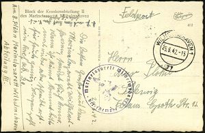 3129 | 15 € | DEUTSCHE KRIEGSMARINE & MARINE-FELDPOST II. WELTKRIEG : WILHELMSHAVEN 1/ yy 1942 (25.6.) 2K-Steg + viol. 1K-HdN: Marinelazarett Wilhelmshaven + hs. Abs. , passende s/w.-Feldpost-Foto-Ak.: Block der Krankenabt. III des Marinelazaretts Wilhelmshaven, seltene u.schöne Kombination! | ![]() ![]() | |