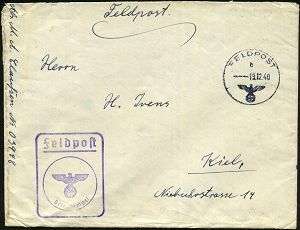 3143 | 12 € | DEUTSCHE KRIEGSMARINE & MARINE-FELDPOST II. WELTKRIEG : DEUTSCHES REICH 1940 (21.12.) stummer 1K-Steg = Tarnstempel + viol. Ra.: FdA/Reich/Marine-Nachrichten-Offizier Nordwest + viol. 3L , klar gest. Marine-Dienstbf. n. Kiel | ![]() | |