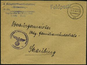 3168 | 15 € | DEUTSCHE KRIEGSMARINE & MARINE-FELDPOST II. WELTKRIEG : DT.BES.NIEDERLANDE 1943 (24.3.) stummer 2K-Steg: "uu" = Tarnstempel Delft + viol. 1K-HdN: Kommando 2. Kriegsschiffbaulehrabteilung + blauer 5L: 2. Kriegsschiffbaulehrabteilung/"Verwaltung"/.. D e l f t. , klar gest. Feldpost-Bf. n. Straubing | ![]() | |
