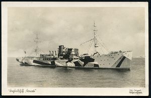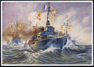 3131 | 12 € | DEUTSCHE KRIEGSMARINE & MARINE-FELDPOST II. WELTKRIEG : DEUTSCHES REICH 1939 Color-Künstler-Ak.: Zerstörer, sign. "KABLO 1939" (Freigabevermerk OKW) ungebr. (Verlag Carl Werner, Reichenbach i.V.) | ![]() | |