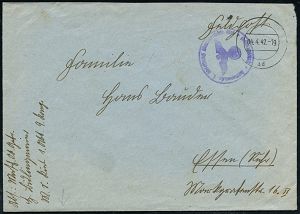 3170 | 15 € | DEUTSCHE KRIEGSMARINE & MARINE-FELDPOST II. WELTKRIEG : DT.BES.NIEDERLANDE 1944 (12.8.) stummer MaWellenSt. = Tarnstempel Amsterdam + viol. 1K-HdN: Feldpostnr. M 01474 = Kommando 1. Artillerie-Träger-Flottille, M.P.A. Amsterdam + rs. Abs.-2L: Obtl. z. S(ee).. Feldpostnr. M 01474 C, gesiegelter Feldpost-Bf. + Inhalt n. Dresden | ![]() | |