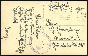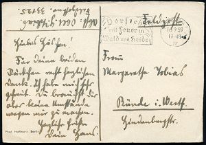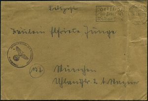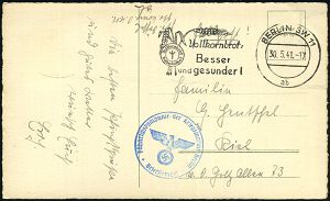 3097 | 18 € | DEUTSCHE KRIEGSMARINE & MARINE-FELDPOST II. WELTKRIEG : BERLIN SW 11/ ab/ Vollkornbrot:/ Besser/ u.gesunder! 1941 (30.5.) Serien-MaWSt (Ähren u. Lebens-Rune) + blauer 1K-HdN: Fähnrichkompanie der Kriegsmarine Berlin + hs. Abs.: "..O.K.M." = Oberkdo. Kriegs-Marine, Oberbefehlshaber = Großadmiral Erich Raeder (1896 - 1960), klar gest. Feldpost-Kt. n. Kiel (Bo.S 373 A , Erstjahr!) | ![]() | |