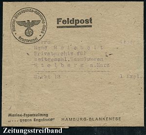 3113 | 25 € | DEUTSCHE KRIEGSMARINE & MARINE-FELDPOST II. WELTKRIEG : Hamburg-Blankenese 1941 (ca.) Feldpost-Zeitungs-Streifband: Marine-Propaganda-Abt. Nord, Marine-Frontzeitung "..gegen Engelland" n. Stolberg | ![]() | |