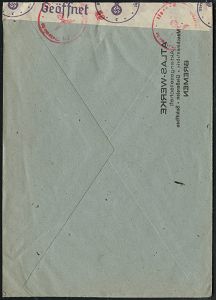 3107 | 25 € | DEUTSCHE KRIEGSMARINE & MARINE-FELDPOST II. WELTKRIEG : CHEMNITZ 1/ Tag der Briefmarke 1941 (12.1.) SSt = Schnellboot auf 6 + 24 Pf. Tag d.Briefmarke + 10 Pf. Hindenbg. (Mi.518, 762) + roter OKW-Zensur-Band-Ma.St. (= Berlin, Rie.B-20 ,100 Pkte.) interess. Text!, seltene Übersee-Zensur-Ktr. n. USA vor Kriegs- Eintritt! (Bo.34) | ![]() | |