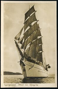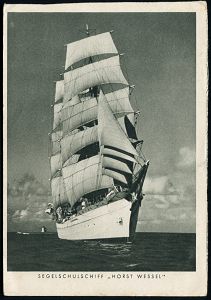 3141 | 12 € | DEUTSCHE KRIEGSMARINE & MARINE-FELDPOST II. WELTKRIEG : DEUTSCHES REICH 1943 s/w.-Foto-Ak.: Segelschulschiff "Albert Leo Schlageter", Indienststellung 1938 , 1944 Minenschaden, brit. Kriegsbeute, 1948 an Brasilien ("Guanabara"), ab 1962 Portugal ("Sagres") bis heute, O.K.W.-Freigabevermerk (Verlag Simonson, Oldenbg.) | ![]() | |