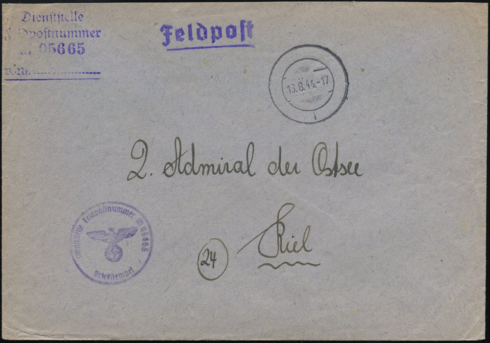 3240 | 20 € | DEUTSCHE MARINE-SCHIFFSPOST II.WELTKRIEG : DEUTSCHES REICH 1944 (18.8.) stummer 2K-Steg = Tarnstempel + 2 verschied. viol. HdN. Fp.-Nr.05665 (1x gering undeutl.) = Sperr-Versuchsverband des S. V. K., Feldpost-Bf. n.Kiel, selten! | ![]() | |