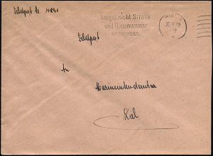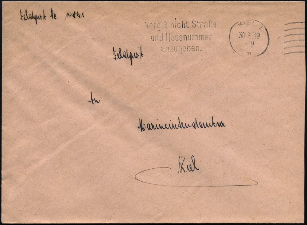 3189 | 25 € | DEUTSCHE MARINE-SCHIFFSPOST II.WELTKRIEG : KIEL 1/ m/ Vergiß nicht Straße/ u.Hausnummer.. 1939 (30.9.) Serien-MWSt + 6 Wellen (rechts) + hs. Abs.: Feldpost Nr. 14841 = Zerstörer "Max Schultz" = "Z 3", Orts-Feldpost-Bf., "Z 3" bereits am 22.2.40 durch Minentreffer gesunken (Bo.S 70 C) | ![]() | |