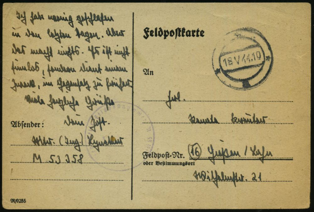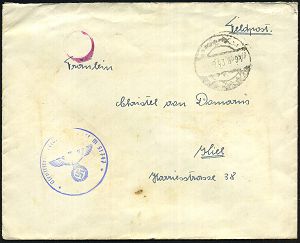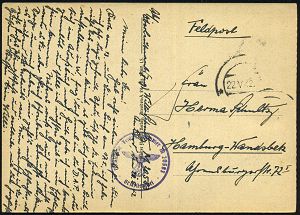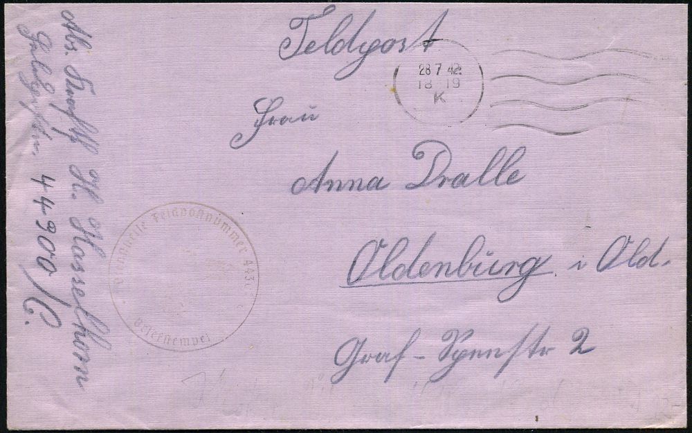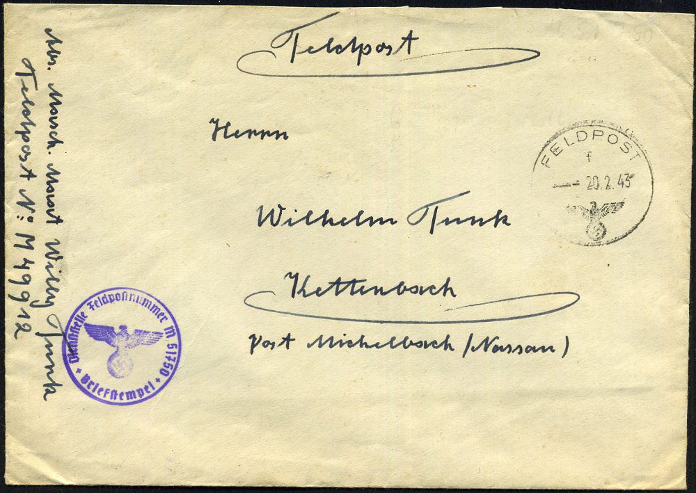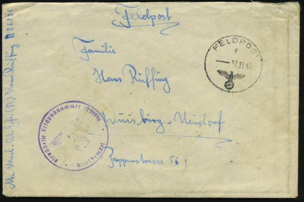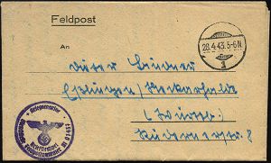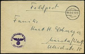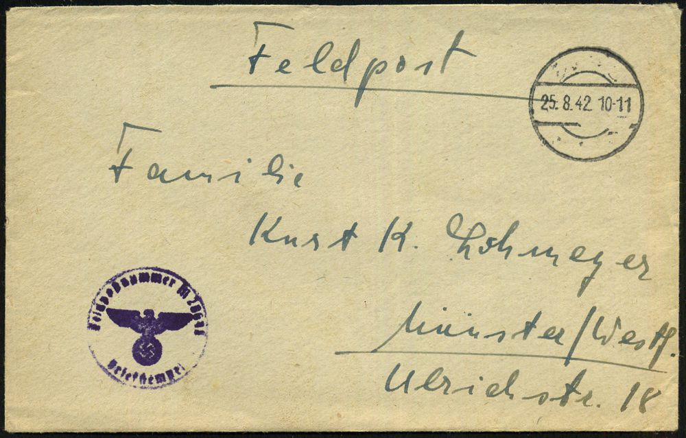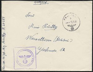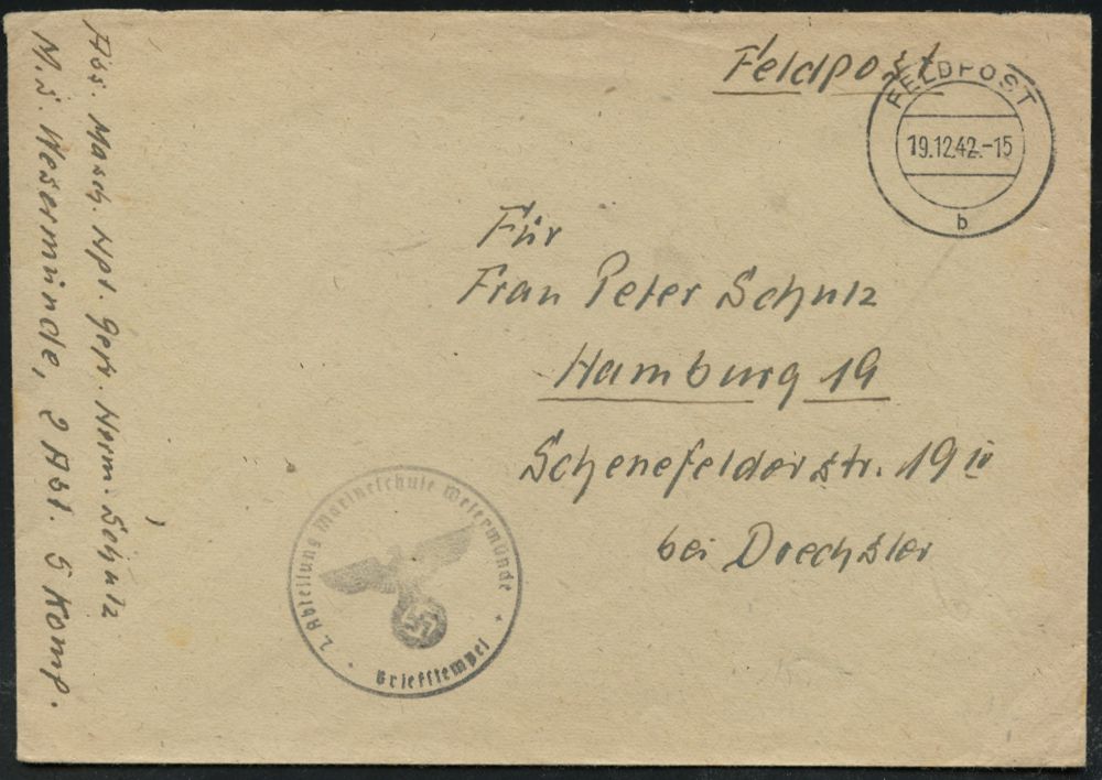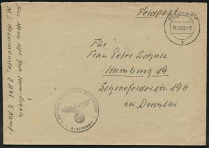 3228 | 25 € | DEUTSCHE MARINE-SCHIFFSPOST II.WELTKRIEG : DEUTSCHES REICH 1942 (17.11.) 1K: FELDPOST/f/--- + viol. 1K-Hdn: Feldpostnr. M 26 896 = Zerstörer "Z 3 0" + hs. Abs. , Feldpost-Bf. (rs. fehlt Klappe) + Inhalt n. Duisburg, 2 Belege kompl. | ![]() | |