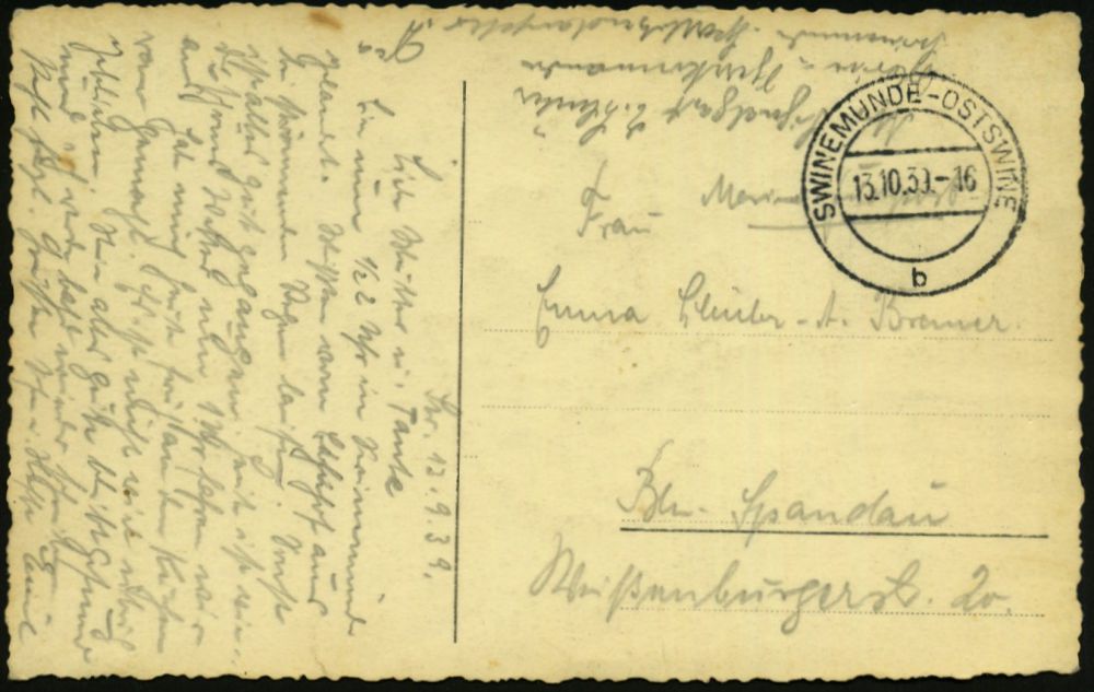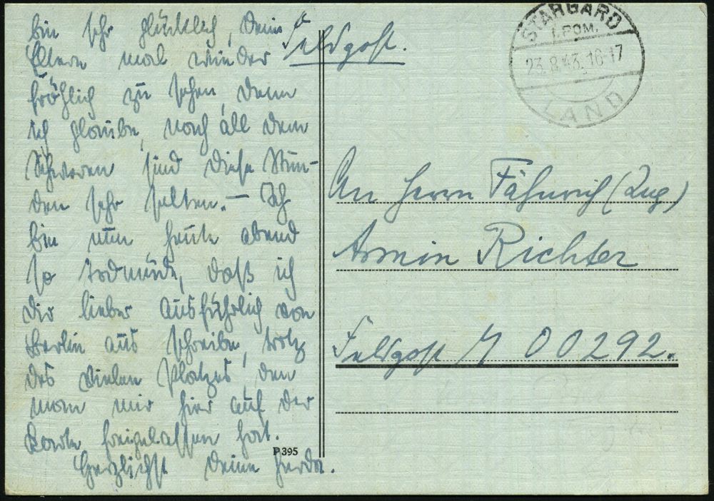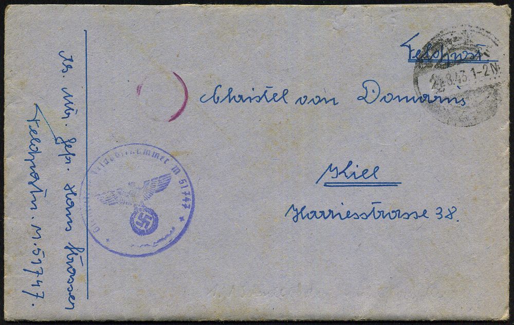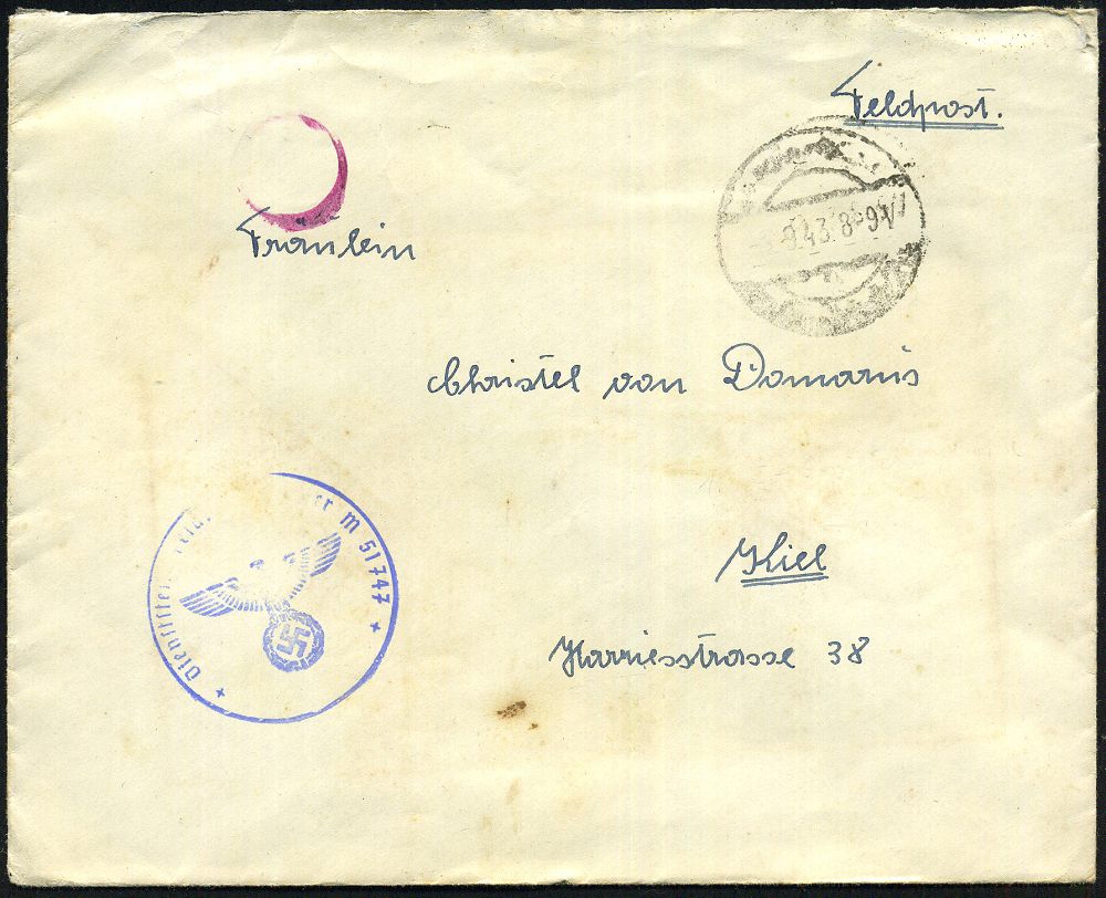3203 | 25 € | DEUTSCHE MARINE-SCHIFFSPOST II.WELTKRIEG : Swinemünde 1943 (Aug./Sept.) 2x stumme 1K-Brücke = Tarnstempel Swinemünde, 2x blauer 1K-HdN: Feldpostnr. M 51747 (teils etw. undeutl., Nr. gut lesbar) + hs. Abs: "..M. 51747" bzw. "..Schnellbootschulflottille, Swindemünde.." 2 Feldpost-Briefe + Inhalt (aus gleicher Korrespondenz) n. Kiel, 2 Belege | ![]() ![]() ![]() | |