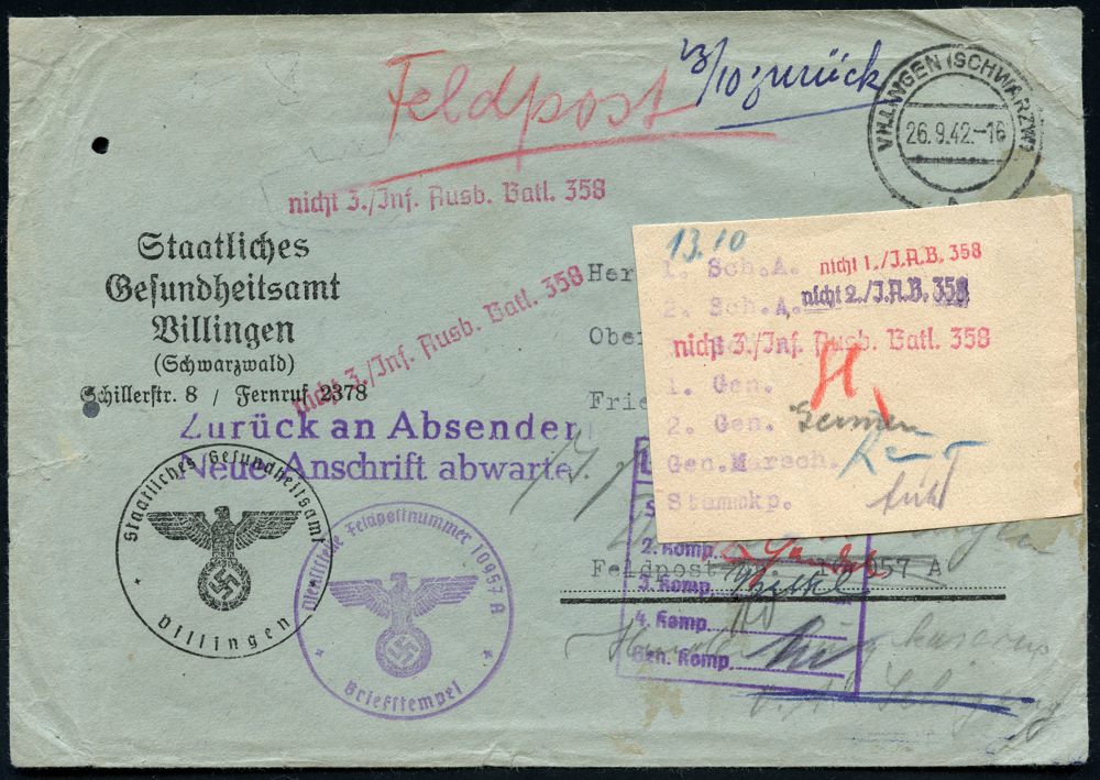 3204 | 20 € | DEUTSCHE MARINE-SCHIFFSPOST II.WELTKRIEG : VILLINGEN (SCHWARZW)/ h 1942 (26.9.) 2K-Steg auf Dienst-Bf.: Staatl. Gesundheitsamt als Feldpost-Bf. (kleine Akten-Lochung) an Fp.Nr. M 10 957 = Minensuchboot "M 104", viol. 1K-Fp.-HdN + viol. 2L: Zurück an Absender/ Neue Anschrift abwarten + Retour-Klebezettel u.a. Hinweisstempel!, Feldpost-Retour-Bf. | ![]() | |