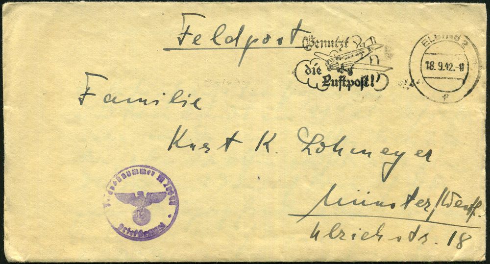 3184 | 15 € | DEUTSCHE MARINE-SCHIFFSPOST II.WELTKRIEG : ELBING 2/ f/ Benutzt/ die/ Luftpost! 1942 (18.9.) Serien-MaWSt (Junkers G-31) + viol. 1K-HdN: Feldpostnr. M 20698 = Torpedoboot-Flottille, T-Boot "T 5" + rs. hs. Abs., Feldpost-Bf. + Inhalt n. Münster/Westf. (Bo.S 71 A) | ![]() ![]() | |