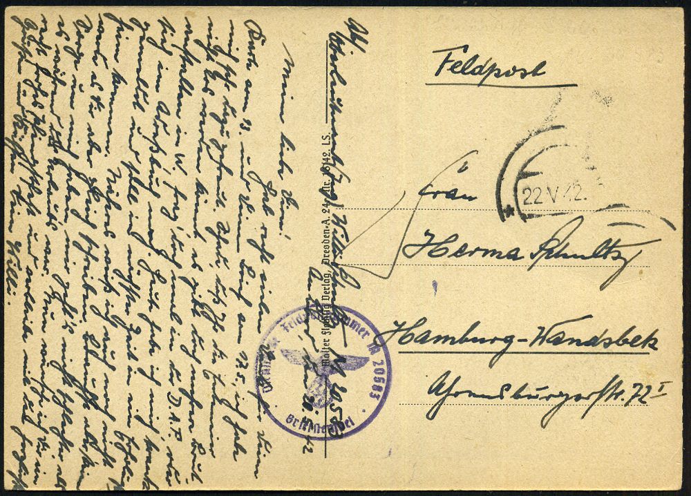 3226 | 12 € | DEUTSCHE MARINE-SCHIFFSPOST II.WELTKRIEG : DEUTSCHES REICH 1942 (6.5.) 1K: FELDPOST/h/--- + blauer 1K-HdN: Feldpostnr. M 25800 = 3. Schnellboot-Flottille , Feldpost-Glückwunsch-Ak. (kl. Schürfstelle) n. Kiel | ![]() | |
