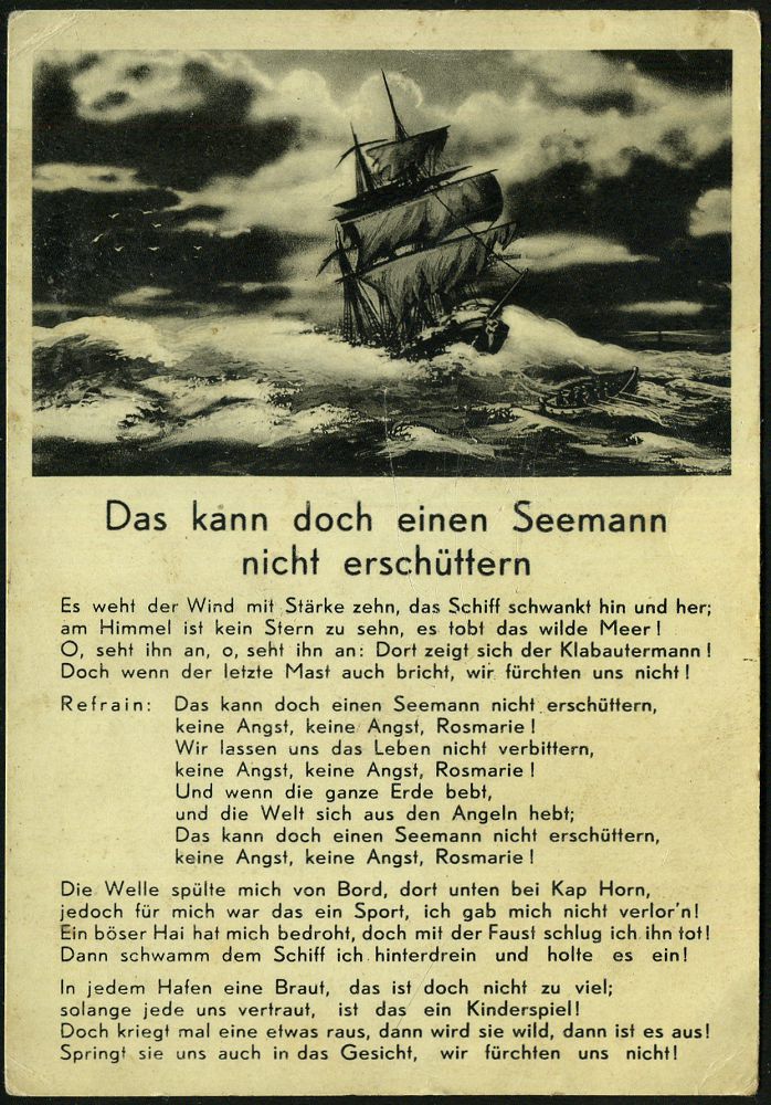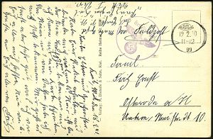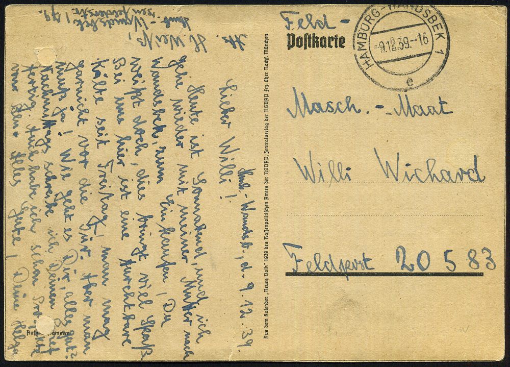 3206 | 25 € | DEUTSCHE MARINE-SCHIFFSPOST II.WELTKRIEG : DEUTSCHES REICH 1939 (28.11.) stummer 2K-Steg = Tarnstempel + blauer 1K-HdN: Feldpostnr. 26242 = Torpedoboot "Jaguar" + hs. Abs.: "..Feldpostnr. 16200" = Torpedoboot "Seeadler" (= beide 6. TB-Flottille) Feldpost-Ak.: Seemanns-Lied "Das kann doch einen Seemann nicht erschüttern.." (+ Liedtext) n. Rendsburg | ![]() ![]() | |