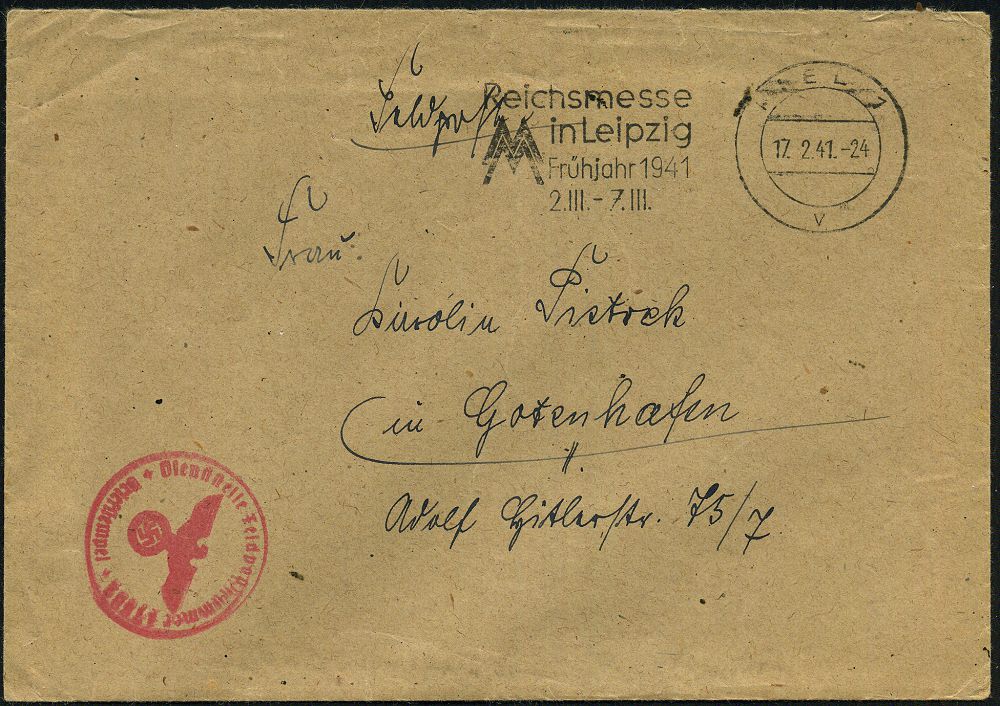 3193 | 25 € | DEUTSCHE MARINE-SCHIFFSPOST II.WELTKRIEG : KIEL 1/ v/ Reichsmesse/ in Leipzig/ Frühjahr.. 1941 (17.2.) Serien-MWSt + roter 1K-HdN: Feldpostnr. 17684 = Linienschiff "Schleswig-Holstein" (Nr. etw. fett) + rs. hs. Abs.: ".. Feldp. Nr. M 17684", Feldpost-Bf. + Inhalt n. Gotenhafen (5.11.-15.121940 Grundüberholung Kriegsmarinewerft Kiel), Wieder-Indienststellung 20.1.1941, Eisnotdienst Ostsee! (bis Ende März) | ![]() ![]() | |