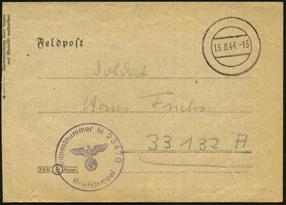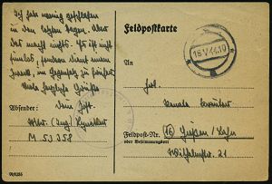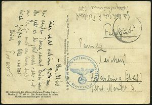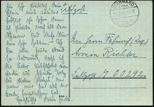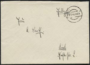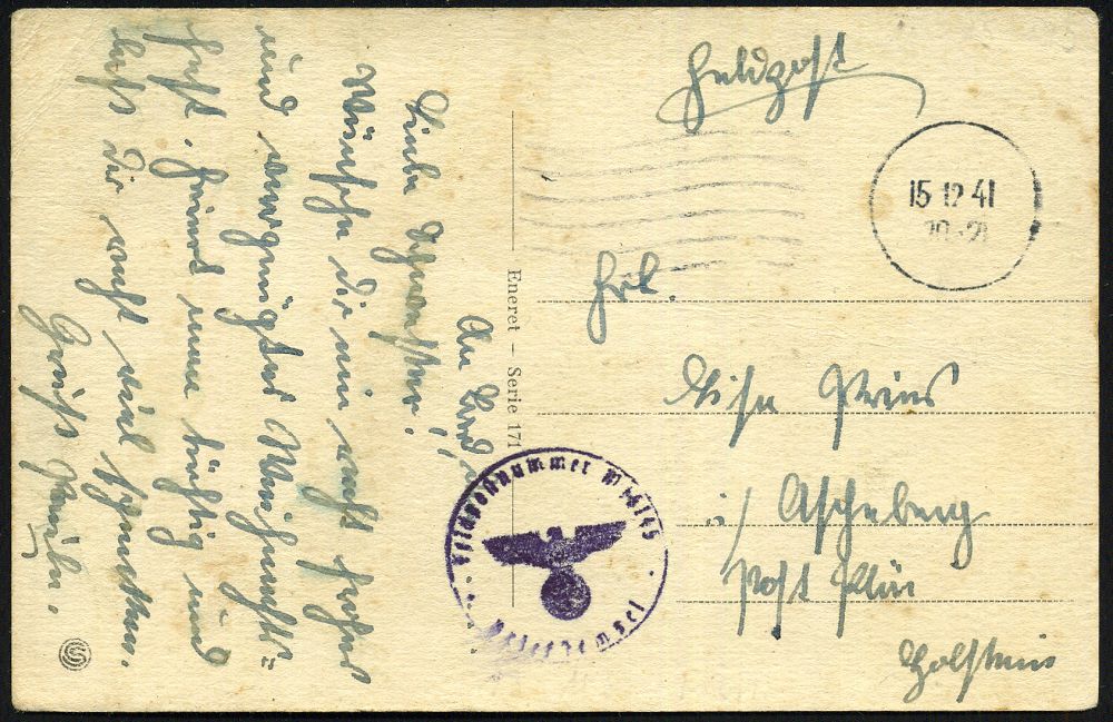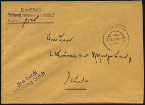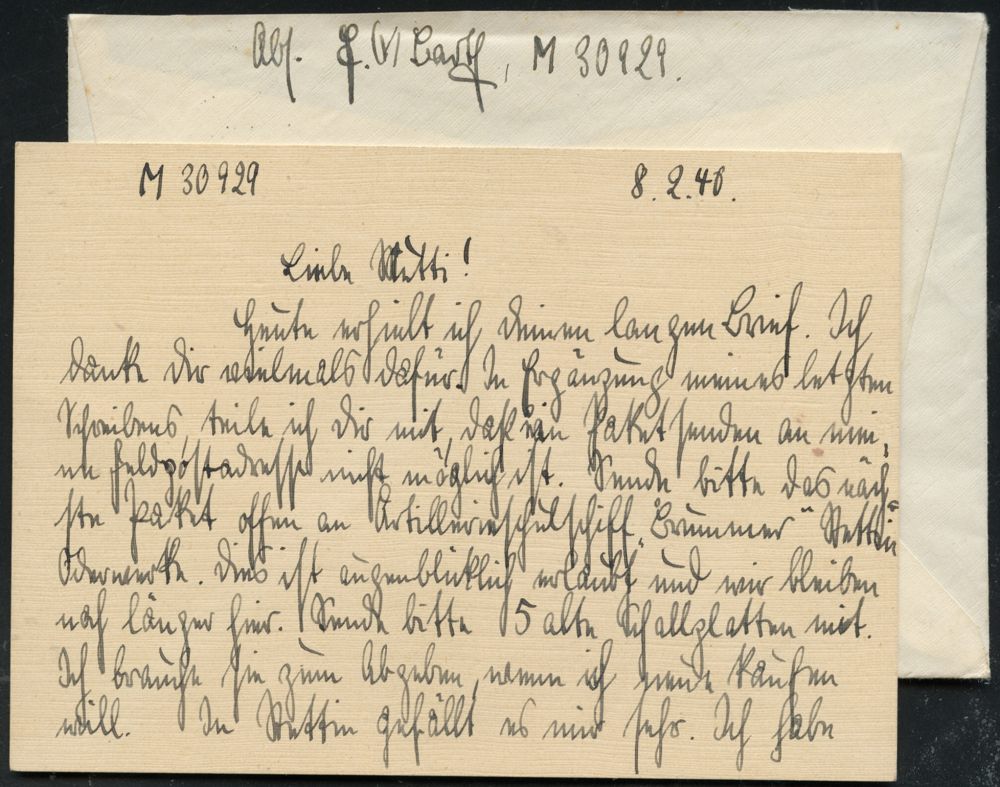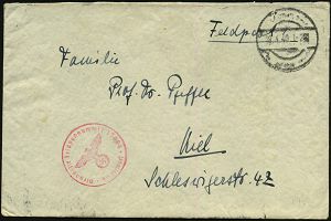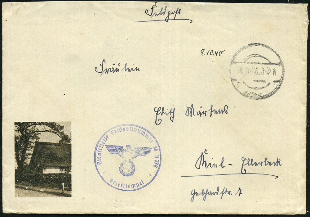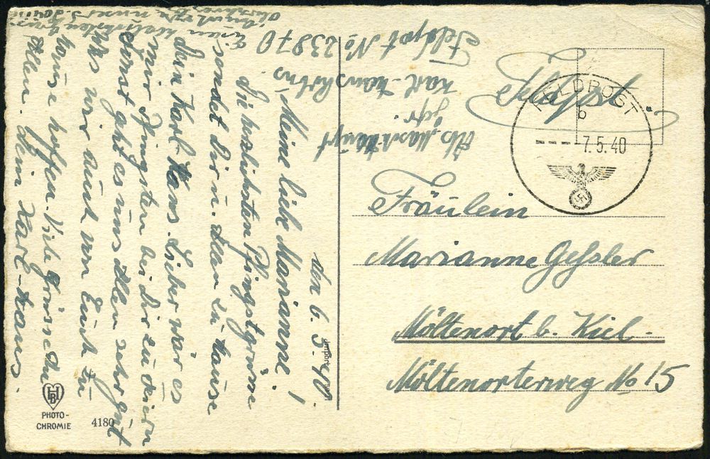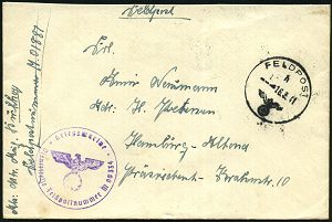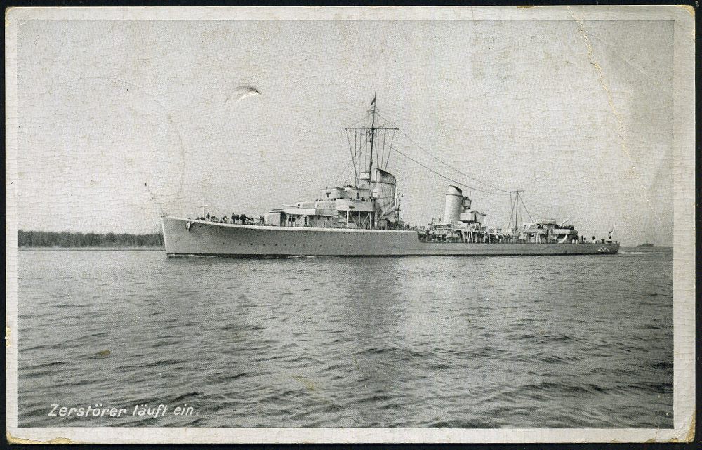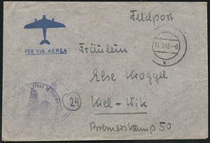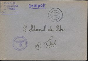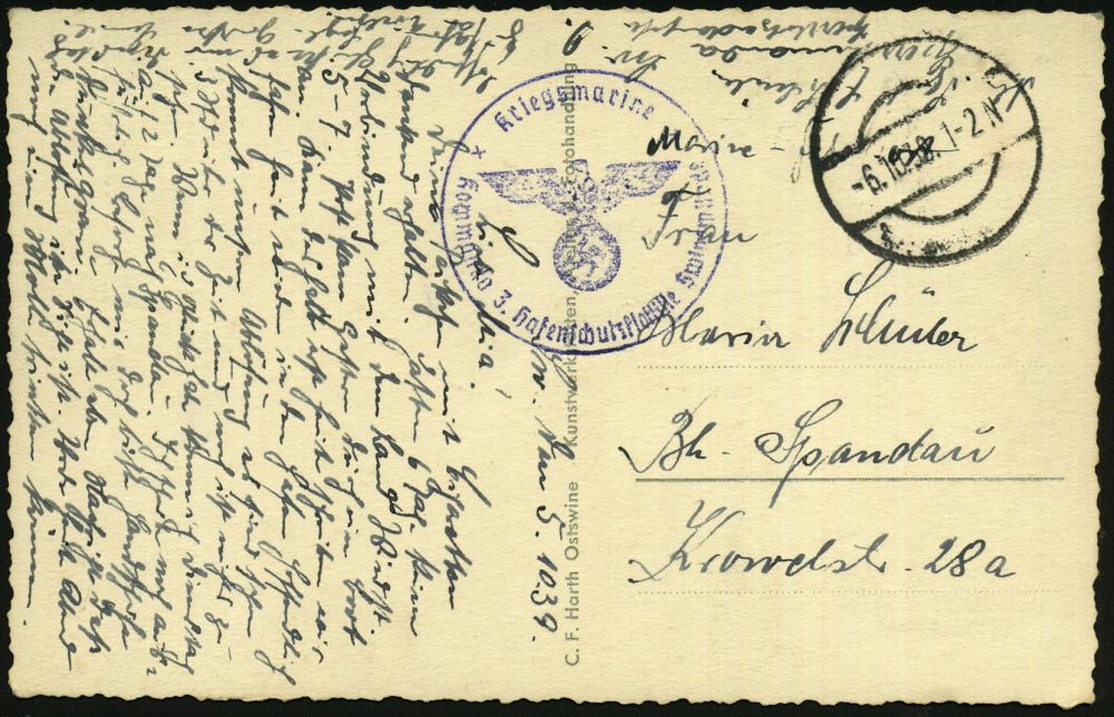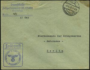 3216 | 25 € | DEUTSCHE MARINE-SCHIFFSPOST II.WELTKRIEG : DEUTSCHES REICH 1940 (10.10.) stumme 1K-Brücke = Tarnstempel + viol. 1K-HdN: Feldpostnr. M 11 378 = Zerstörer "Z 23" , 8. Zerstörer-Flottille + rs. hs. Abs., illustrierter Feldpost-Bf. + illustrierter Inhalt n. Kiel, das Schiff wurde nach Bombentreffer auf der Werft La Pallice (Frankr.) am 21.8.1944 außer Dienst gestellt | ![]() ![]() | |