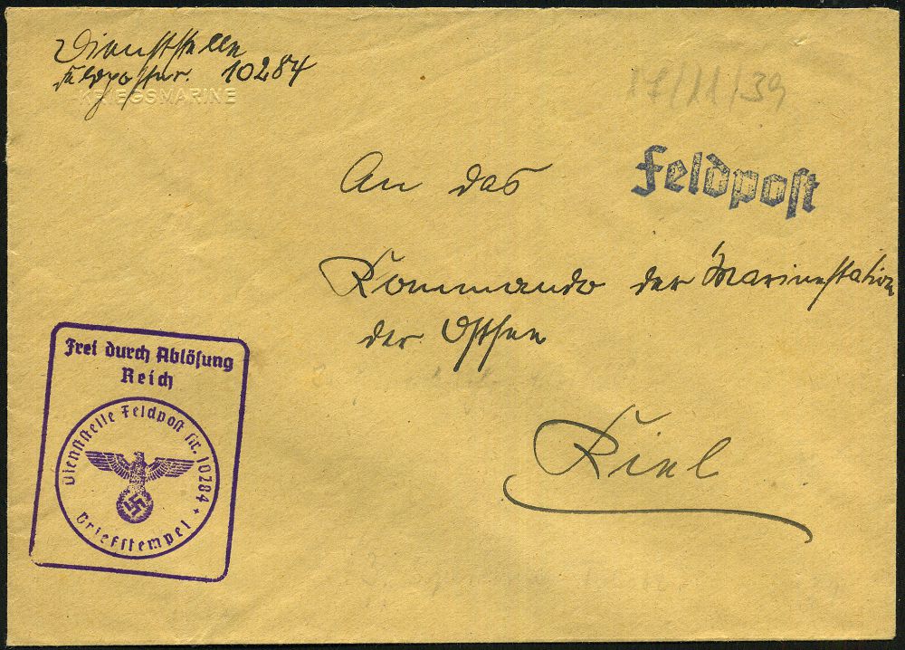 3207 | 18 € | DEUTSCHE MARINE-SCHIFFSPOST II.WELTKRIEG : DEUTSCHES REICH 1939 (Nov.) viol. Ra.: Frei durch Ablösung/Reich/..Feldpost Nr. 10284 = 3. Sperrbrecher-Flottille + hs. Fp.-Nr. "..Feldpostnr. 10284" , klar gest. Marine-Dienst-Bf. mit Blindprägung: KRIEGSMARINE n. Kiel | ![]() | |