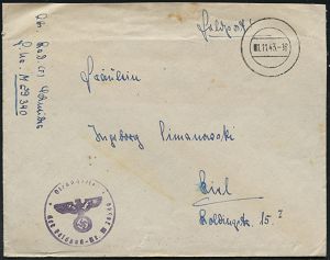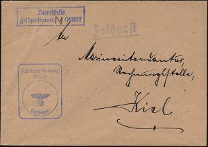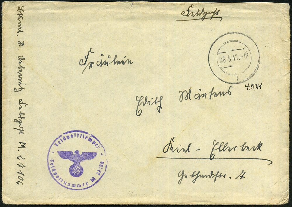 3220 | 15 € | DEUTSCHE MARINE-SCHIFFSPOST II.WELTKRIEG : DEUTSCHES REICH 1941 (6.5.) stummer 2K-Steg = Tarnstempel + viol. 1K-HdN: Feldpostnr. M 27106 = 5. Torpedoboot-Flottille, Boot "M ö w e" (Bf. oben kl. Rißchen) + hs. Abs., klar gest. Feldpost-Bf. + Inhalt n. Kiel | ![]() | |