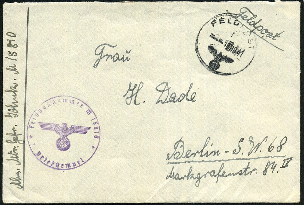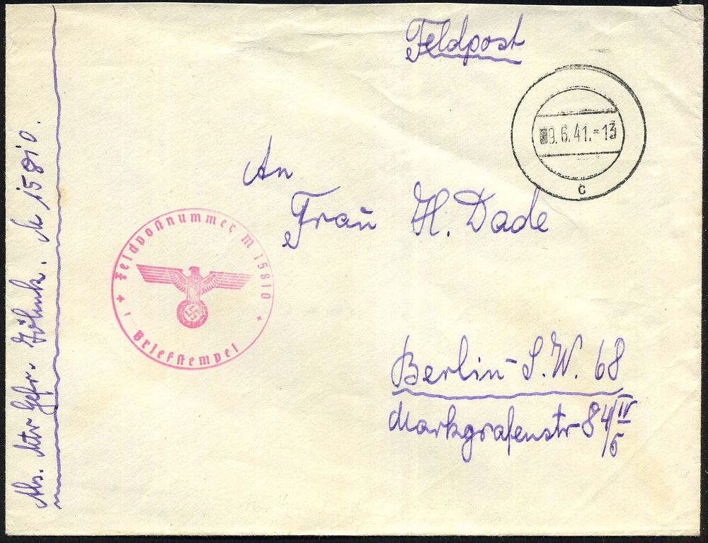 3223 | 16 € | DEUTSCHE MARINE-SCHIFFSPOST II.WELTKRIEG : DEUTSCHES REICH 1941 (1.10.) 1K: FELDPOST/f/--- + viol. 1K-HdN: Feldpostnr. M 15810 = 16. Vorpostenboot-Flottille, Boot "V 1601" + vs. hs. Abs., kleiner Feldpost-Bf. n. Berlin | ![]() | |