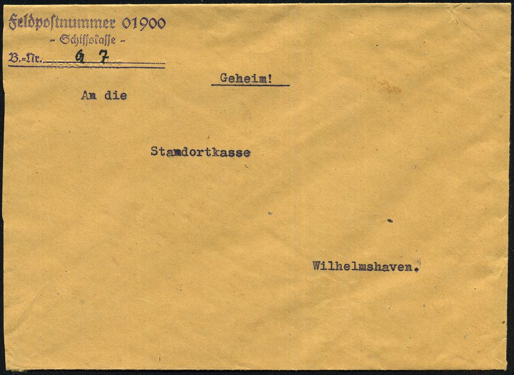 3218 | 25 € | DEUTSCHE MARINE-SCHIFFSPOST II.WELTKRIEG : DEUTSCHES REICH 1941 (ca.) viol. 3L: Feldpostnummer 01900/-Schiffskasse-... = Hilfminenleger "Cobra" (ex Seebäderschiff) + maschinengeschr. "G e h e i m !" , klar gest. K u r i e r - Feldpostbf. (rs. Papierreste) n. Wilhelmshaven, ab August 1941 Ostsee-Einsatz, am 27.8.1942 durch Fliegerbombe in Schiendam (NL) versenkt | ![]() | |