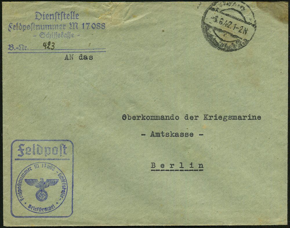 3227 | 18 € | DEUTSCHE MARINE-SCHIFFSPOST II.WELTKRIEG : DEUTSCHES REICH 1942 (5.6.) stumme 1K-Brücke + blauer Ra.: Feldpost/Feldpostnr. M 17088 - Schiffskasse - = Minenschiff "Roland" (ex Seebäderschiff) + blauer 4L (Bf. oben Riß geschl., rs. Klappe fehlt) klar gest. Feldpost-Bf. an O.K. Marine, Berlin, das Schiff war ab 24.8.1939 Hilfskriegsschiff, im April 1944 durch Minentreffer in der Ostsee gesunken | ![]() | |