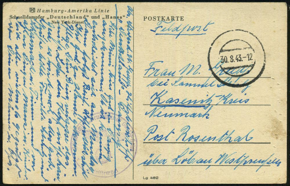 3181 | 40 € | DEUTSCHE MARINE-SCHIFFSPOST II.WELTKRIEG : Danzig 1943 (30.8.) stummer 2K-Steg = Tarnstempel Danzig + viol. 1K-HdN: Hilfsbeischiff Deutschland Danzig-Holm + hs. Abs.: "..Hilfsbeischiff ´Deutschland´, Danzig" = ehem HAPAG-Fahrgastschiff Nordamerika-Dienst, jetzt Marine-Wohnschiff auf passender Feldpost-Künstler-Ak.: Schnelldampfer "Deutschland" n. Löbau, schöne Kombination, vergl. Los Nr.3182 (am 3.5.1945 versenkt !) | ![]() ![]() | |