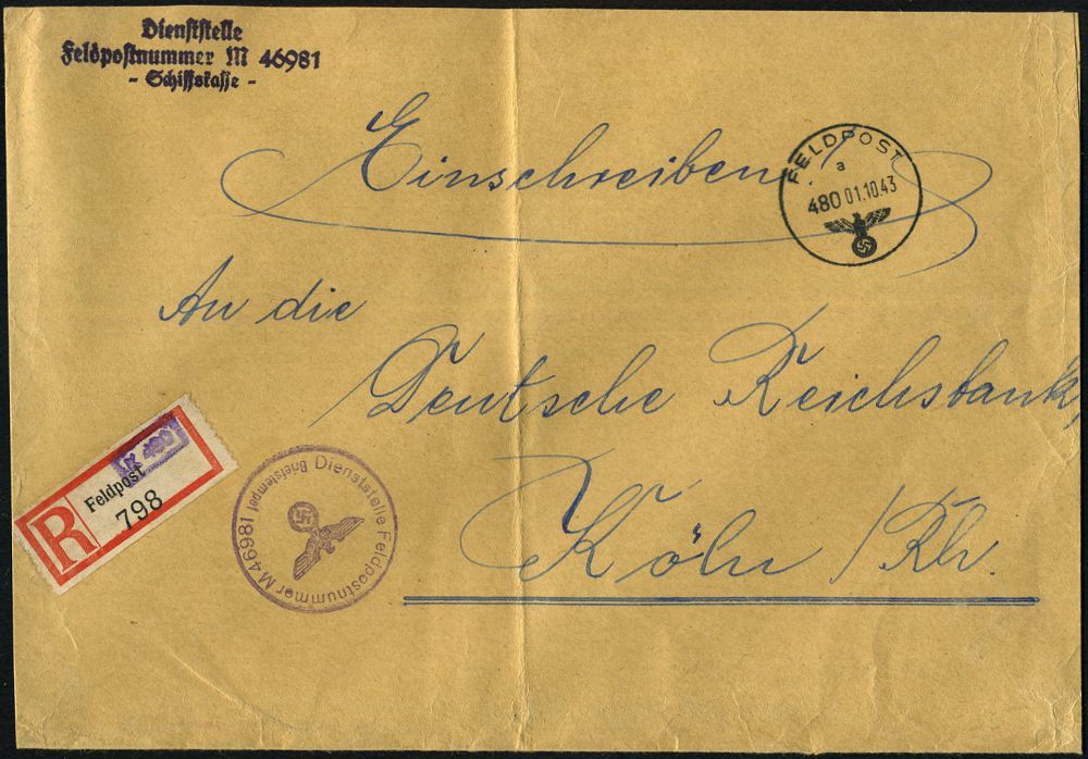 3234 | 25 € | DEUTSCHE MARINE-SCHIFFSPOST II.WELTKRIEG : DEUTSCHES REICH 1943 (1.10.) 1K: FELDPOST/a/480 + provis. RZ: Feldpost K 480 + viol. 1K-HdN: Feldpostnr. M 46981 + viol. Abs.-3L: ..Feldpostnr. M 46981/- Schiffskasse - = 12. Räumboot-Flottille auch noch 1x rs. (Bf. Mittelfalte) klar gest., großer Feldpost-R-Bf. an Reichsbank, Köln | ![]() | |