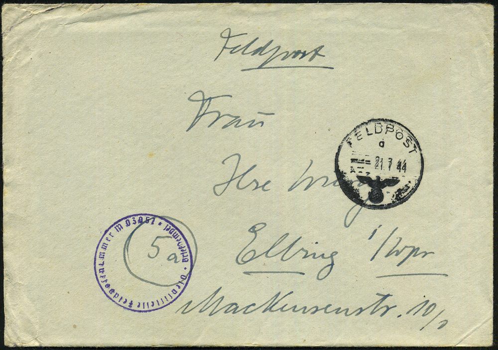 3245 | 25 € | DEUTSCHE MARINE-SCHIFFSPOST II.WELTKRIEG : DEUTSCHES REICH / FRANKREICH 1944 (21.7.) 1K: FELDPOST/d/--- + viol. 1K-HdN: Feldpostnr. M 03052 = 8. Zerstörer-Flottille in F r a n k r e i c h n a c h der Invasion der Alliierten! + rs. hs. Abs.: ".. M 03052, Mar.(ine) Postamt Paris", Feldpost-Bf. + Inhalt n. Elbing | ![]() ![]() | |
