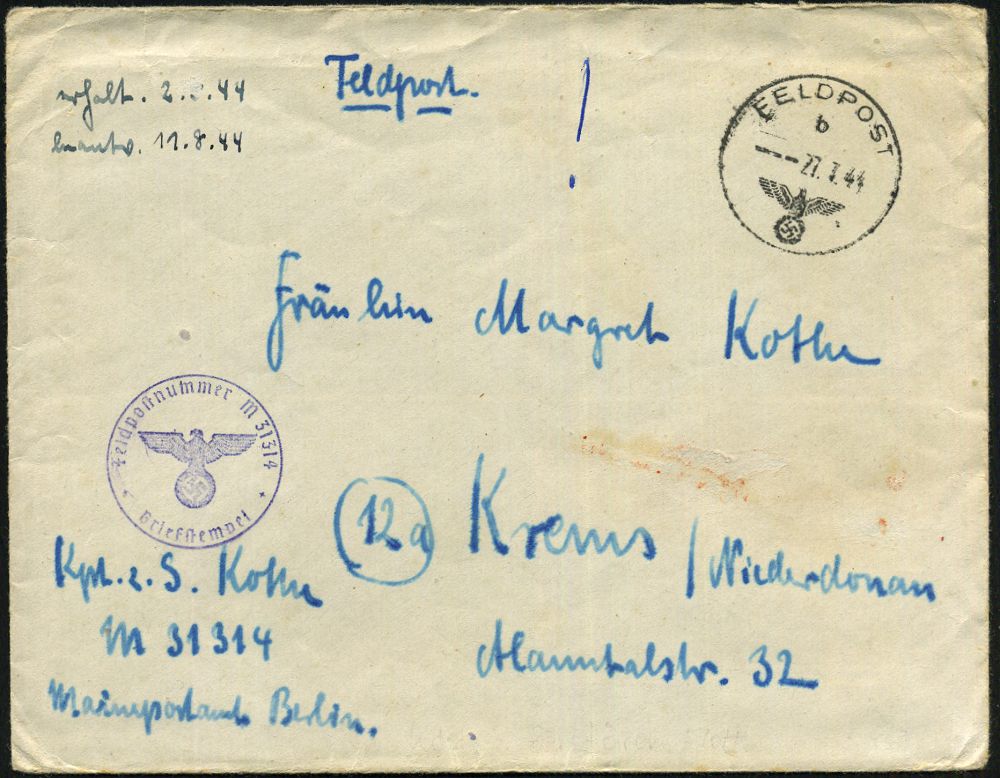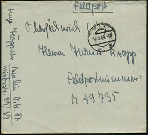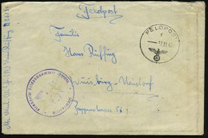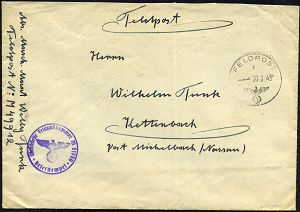 3239 | 18 € | DEUTSCHE MARINE-SCHIFFSPOST II.WELTKRIEG : DEUTSCHES REICH 1944 (27.1.) 1K: FELDPOST/b/--- + viol. 1K-HdN: Feldpostnr. M 31314 = Kommando 6. Zerstörer-Flottille + vs. hs. Abs.: ".. M 31314 Marinepostamt Berlin", klar gest. Feldpost-Bf. (kl. Schürfung vs.) rs. hs. Bemerkung zum Marinepostbüro Berlin /Kapitän z. See) n. Krems | ![]() | |
