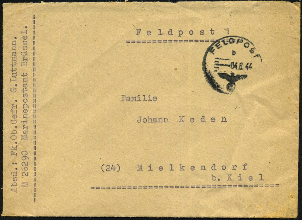 3244 | 12 € | DEUTSCHE MARINE-SCHIFFSPOST II.WELTKRIEG : DT.BES.BELGIEN 1944 (4.8.) 1K: FELDPOST/b/--- + maschinengeschr. Abs.: "..M 26290 Marinepostamt Brüssel" = 38. Minensuch-Flottille , Feldpost-Bf. + Inhalt n. Mielkendorf | ![]() | |