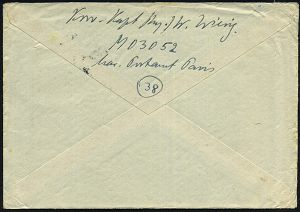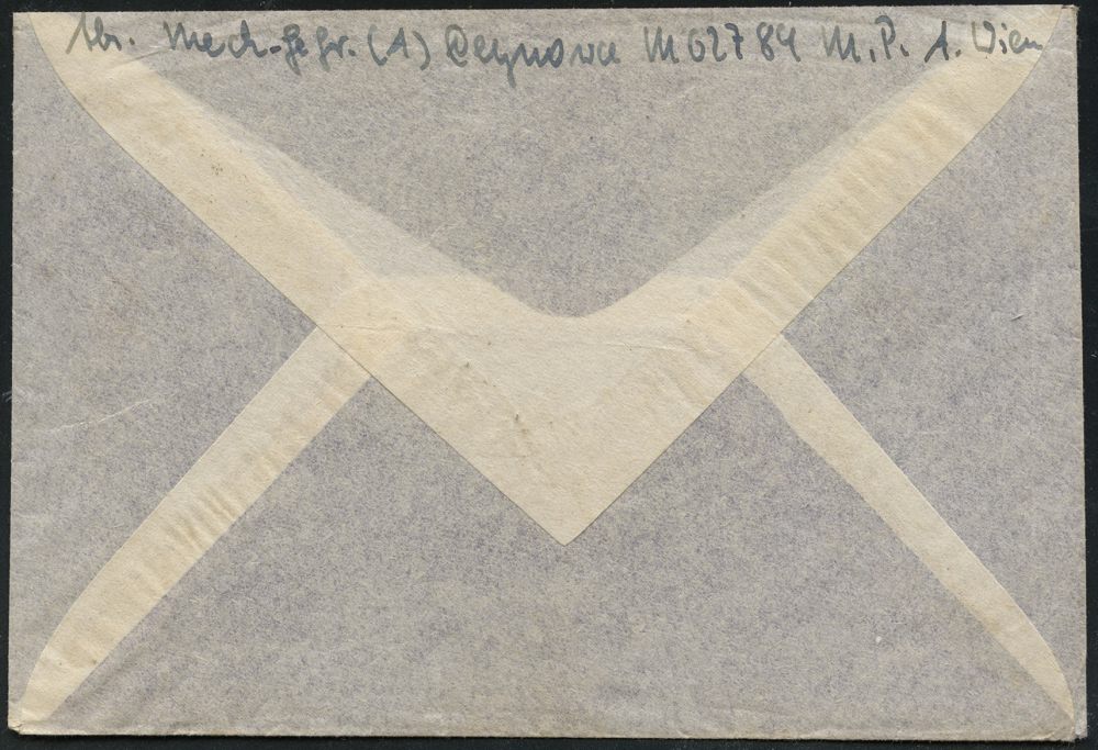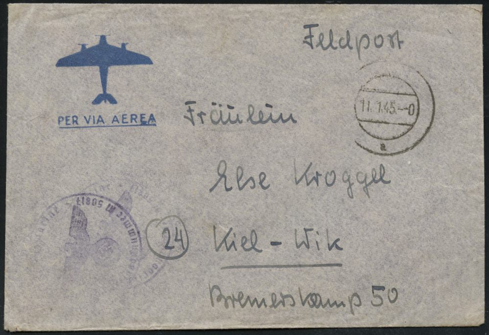 3242 | 25 € | DEUTSCHE MARINE-SCHIFFSPOST II.WELTKRIEG : DEUTSCHES REICH 1945 (11.1.) stummer 2K-Steg = Tarnstempel + viol. 1K-HdN: Feldpostnr. M 62789 (teils etw. undeutl.) + rs. hs. Abs.: "..M 62789 M.P.A. Wien" = 1. Geleit-Flottille, Boot "T A 44" , seltener Luft-Feldpost-Bf. (italien. Beuteumschlag) Einatz Italien ? n. Kiel-Wik | ![]() ![]() | |