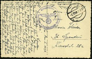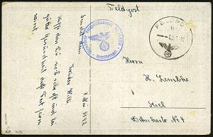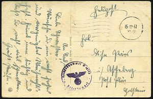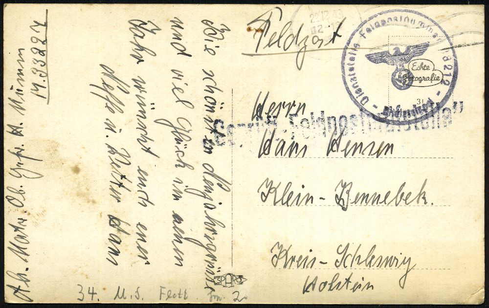3248 | 25 € | DEUTSCHE MARINE-SCHIFFSPOST II.WELTKRIEG : DT.BES.NIEDERLANDE 1943 (22.12.) stummer MaWellenSt. = Tarnstempel Den Haag (oben nicht ganz voll) + viol. 1K-HdN: Feldpostnr. 03212 = 34. Minensuch-Flottille Gruppe 2 + hs. Abs.: "..M. 33 227" = 20. Bordpost Flotten Kdo. + blauer Zensur-1L: "Geprüft Feldpostprüfstelle" (Mi.13.1 + 50.- EUR), niederländische Neujahrs-Feldpost-Zensur-Ak. n. Klein-Bennebek, selten! | ![]() ![]() | |