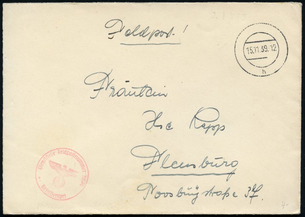 3205 | 25 € | DEUTSCHE MARINE-SCHIFFSPOST II.WELTKRIEG : DEUTSCHES REICH 1939 (15.11.) stummer 2K-Steg "h" = Tarnstempel + roter HdN: Feldpost Nr. 21 879 = Kreuzer "N ü r n b e r g" + rs. hs. Abs., klar gest. Feldpost-Bf. n. Flensburg | ![]() | |