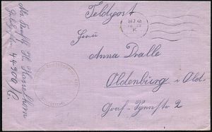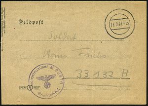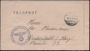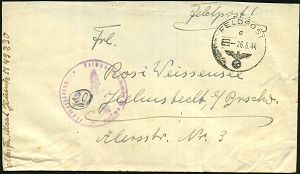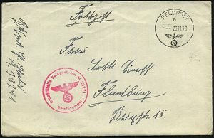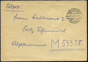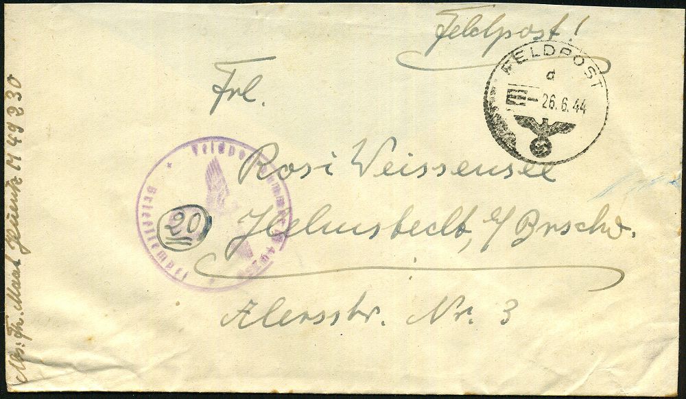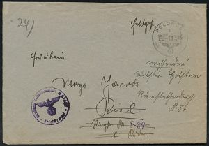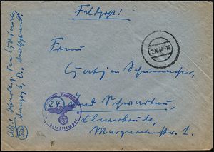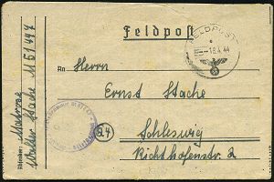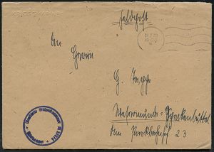 3238 | 12 € | DEUTSCHE MARINE-SCHIFFSPOST II.WELTKRIEG : DEUTSCHES REICH 1944 (26.6.) 1K: FELDPOST/d/--- + viol. 1K-HdN: Feldpostnr. M 49230 = 6. Minensuch-Flottille + hs. Abd., Feldpost-Bf. (rs. Klappe fehlt) + Inhalt n. Helmstedt | ![]() | |