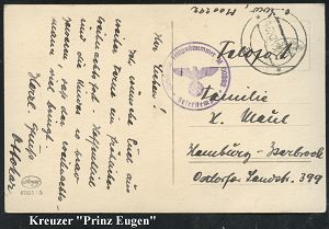 3192 | 45 € | DEUTSCHE MARINE-SCHIFFSPOST II.WELTKRIEG : Kiel 1940 (19.2.) stummer 1K-MaSt. ohne Werbetext = Tarnstempel Kiel + viol. 1K-Hakenkreuz-HdN: Briefstempel ohne Nr. + hs. unzulässiger Klartext-Abs.: ".. Prinz Eugen" Kiel Wik, I. Div. = schwerer Kreuzer, während der Ausrüstungs-Phase, Indienststellung am 1.8.1940 (noch kein Briefstempel vorhanden), Feldpost-Ak.: Segelregatta Kiel (vergl. Los Nr.3185), 1945 US-Kriegsbeute (bei Atomtest im Bikini-Atoll vernichtet) | ![]() ![]() | |