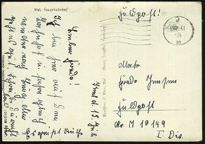 3194 | 25 € | DEUTSCHE MARINE-SCHIFFSPOST II.WELTKRIEG : Kiel 1941 (15.7.) stummer MaWellenSt. "gg" = Tarnstempel Kiel , klar gest. s/w.-Feldpost-Ak. (Haupt-Bhf.) an Feldpost-Nr. M 10 149 = Schwerer Kreuzer "Admiral Scheer" | ![]() ![]() | |