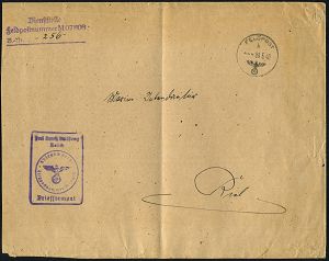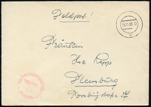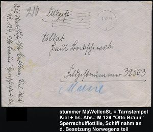 3191 | 25 € | DEUTSCHE MARINE-SCHIFFSPOST II.WELTKRIEG : Kiel 1 1939 (1.12.) stummer MaWellenSt.: 1/m = Tarnstempel Kiel + hs. Abs.: M 129 "Otto Braun" Sperrschulflottille = Übungs-Sperrbrecher, Feldpost-Bf. an Fp.-Nr. 32 503 = Marine-Flak-Abt. in Zweidorf, das Schiff nahm an bevorstehender Besetzung Norwegens teil ("Weserübung") | ![]() | |