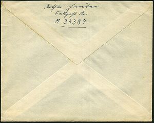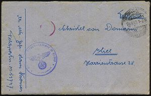 3182 | 30 € | DEUTSCHE MARINE-SCHIFFSPOST II.WELTKRIEG : Danzig 1944 (2.10.) stummer 2K-Steg = Tarnstempel Danzig + viol. 1K-HdN: ..Beischiff "Deutschland" + hs. Abs.: ..(5 a) Danzig, D. "Deutschland", seltener Feldpost-Bf (unten Randbräunung)., Dampfer "Deutschland" wurde am 3.5.1945 in der Lübecker Bucht von brit. Tieffliegern mit KZ-Häftlingen aus KZ Neuengamme versenkt! (vergl Los Nr. 3181) | ![]() | |