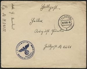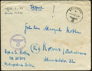 3243 | 14 € | DEUTSCHE MARINE-SCHIFFSPOST II.WELTKRIEG : DEUTSCHES REICH 1942 (20.2.) 1K: FELDPOST/f/--- + viol. 1K-HdN: Feldpostnr. M 51750 = 6. Vorpostboot-Flottille + vs. hs. Abs., Feldpost-Bf. + Inhalt n. Kettenbach | ![]() | |