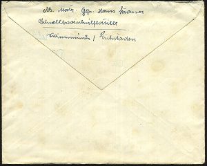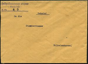 3209 | 25 € | DEUTSCHE MARINE-SCHIFFSPOST II.WELTKRIEG : DEUTSCHES REICH 1940 (9.2.) stumme 1K-Brücke = Tarnstempel + rs. hs. Abs.: "..M 30 929" = Artillerie-Schulschiff "Brummer", Teilnahme "Weserübung" , klar gest. Feldpost-Bf. + Inhalt n. Kiel, "Brummer" wurde bereits am 14.4.1940 im Kattegat durch brit. U-Boot "Sterlet" versenkt! | ![]() ![]() | |