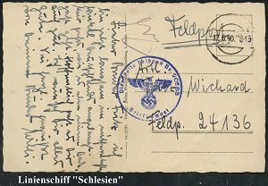3215 | 25 € | DEUTSCHE MARINE-SCHIFFSPOST II.WELTKRIEG : DEUTSCHES REICH 1940 (17.6.) stumme 1K-Brücke = Tarnstempel + viol. 1K-HdN: Feldpost Nr. 20583 = Linienschiff "Schlesien", ab 2.8. Stillegung mit Notbesatzung bis 1941, dann als Eisbrecher eingesetzt , klar gest. s/w.-Feldpost-Foto-Ak.: Panzerschiff "Graf Spee" an Fp.-Nr. 24136 | ![]() ![]() | |