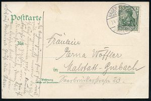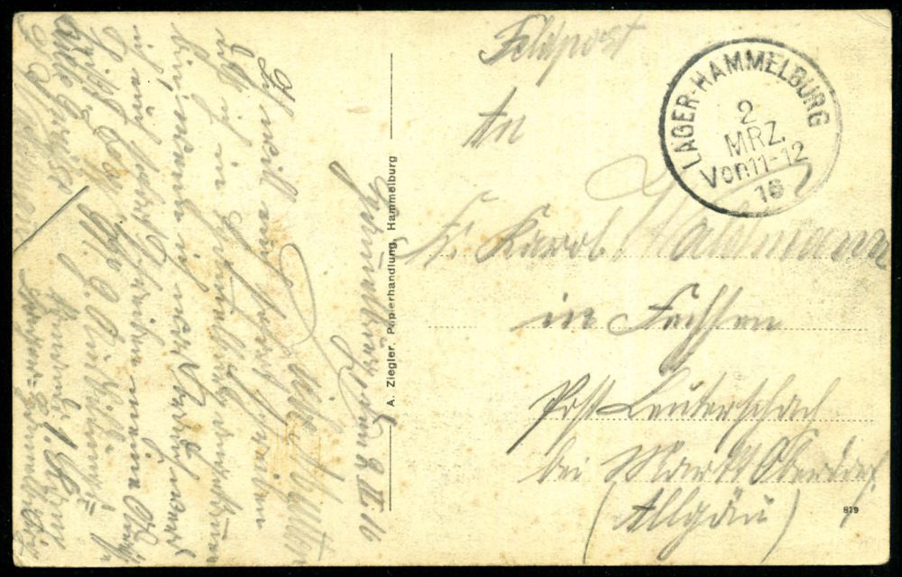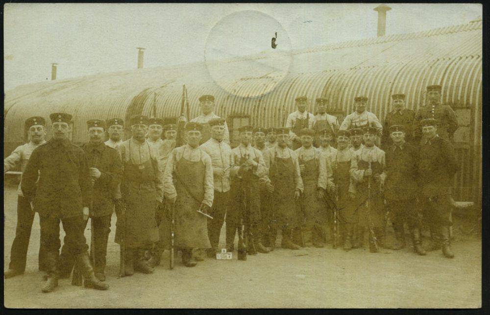 197 | 15 € | TRUPPENÜBUNGSPLÄTZE bis 1918 : HAMMELBURG LAGER 1914 (24.6.) 1K = Hauspostamt Truppenübungsplatz auf s/w.-Foto-Ak.: Zielbau 1914.. noch 100 (Tage) = Gruppenfoto Wehrpflichtige, Soldatenkarte mit Nachgebühr 10 Pf., da Vermerk "Soldatenkarte" fehlt, noch keine Feldpost! n. Pirmasens (Uhv.: O.Hepperlin, Photogr. Kunstanstalt Hammelbg. 1914) | ![]() ![]() | |