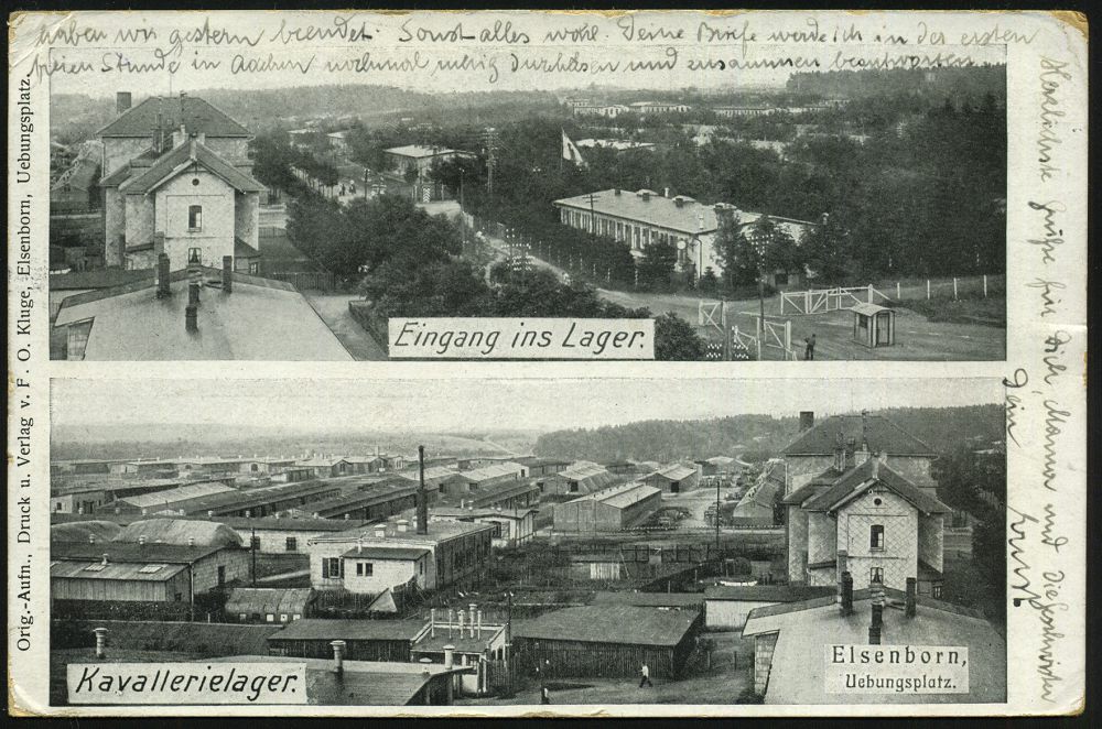 182 | 15 € | TRUPPENÜBUNGSPLÄTZE bis 1918 : ELSENBORN-/ *a/ ÜBUNGSPLATZ 1915 (30.10.) 1K-Brücke + viol., aptierter Zensur-Ra.: Malmedy P. K. zu befördern (Rie.2) s/w.-Foto-Ak.: Eingang ins Lager, Kavallerielager.. (2 Ansichten, Kreidekarton, kl. Beförd.-Spuren) Feldpost-Zensur-Kt. n. Köln | ![]() ![]() | |