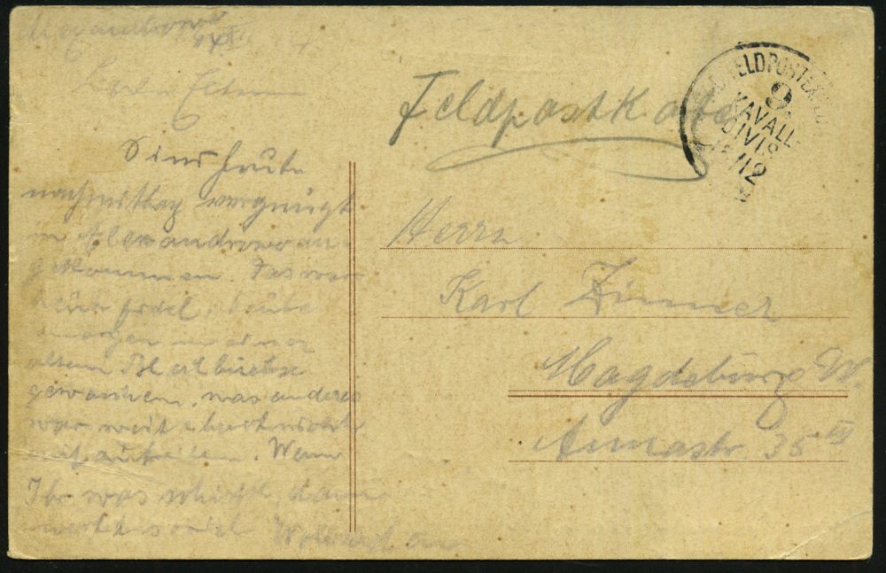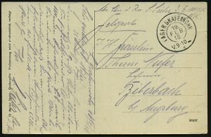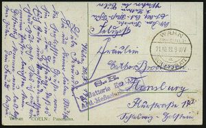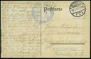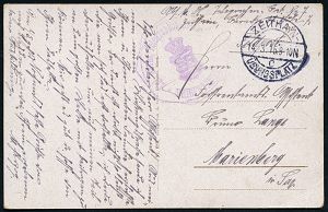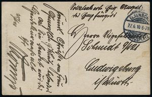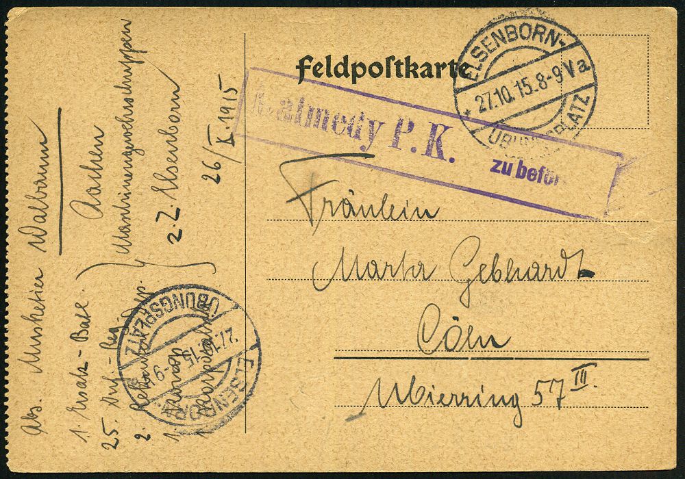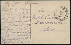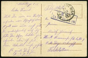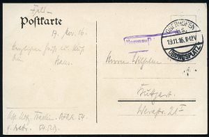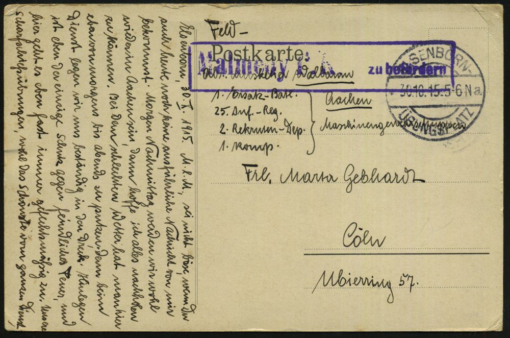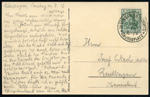 181 | 14 € | TRUPPENÜBUNGSPLÄTZE bis 1918 : ELSENBORN-/ *a/ ÜBUNGSPLATZ 1915 (27.10.) 1K-Brücke = Hauspostamt Truppenübungsplatz 2x !+ viol. Zensur-Ra.: Malmedy P. K. /Geprüft und/zu befördern (rechts gering undeutl.) + hs. Abs.: ".. Aachen Maschinengewehrschuppen z. Z. Elsenborn.. 25. Jnf. Reg..." (rechts Riß geschl.), Feldpost-Zensur-Kt. n. Köln | ![]() | |