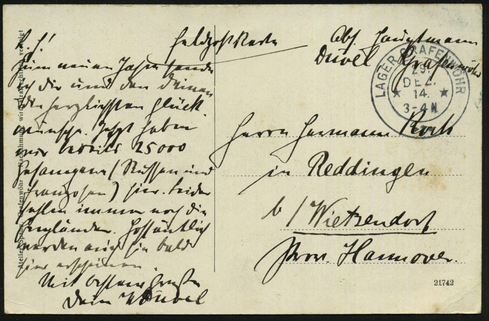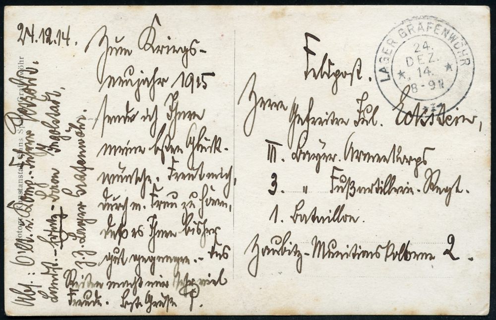 185 | 14 € | TRUPPENÜBUNGSPLÄTZE bis 1918 : GRAFENWÖHR LAGER/ ** 1914 (24.12.) 2K mit Zierstück = Hauspostamt Truppenübungsplatz klar auf individueller s/w.-Foto-Ak.: Oberleutnant des Landsturms Ingolstadt zu Pferd + entspr. hs. Abs., Feldpost-Kt. an das 3. Fuß-Artl.-Regt. | ![]() ![]() | |