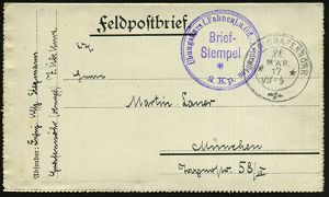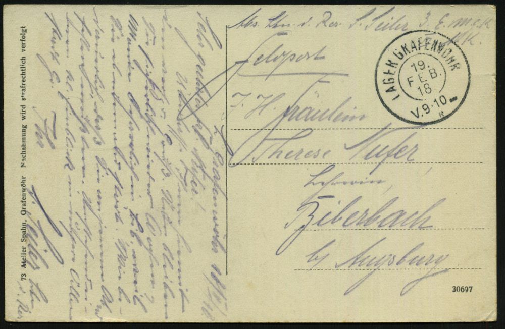 187 | 12 € | TRUPPENÜBUNGSPLÄTZE bis 1918 : GRAFENWÖHR LAGER/ ** 1917 (26.3.) 2K mit Zierstück auf Feldpost-Faltbf. mit Inhalt, hs. Abs.: "Fahn(en)j(unker) 7. Üb.(ungs) Kurs" + viol. 2K-HdN: Übungskurs f. Fahnenj. u. Off.-Anwärter.. n. München | ![]() | |