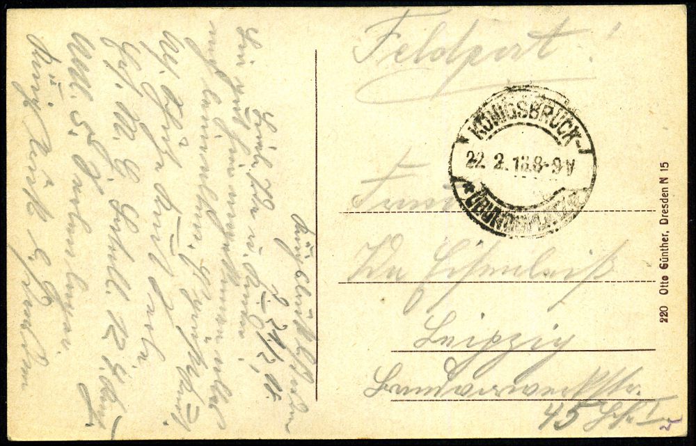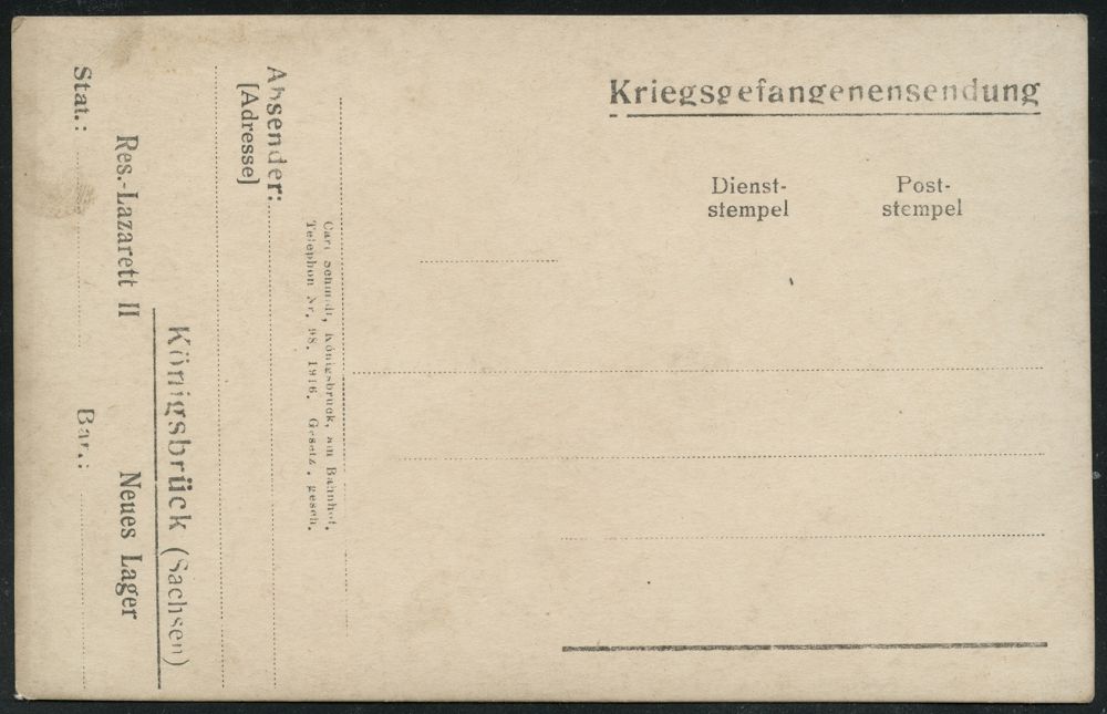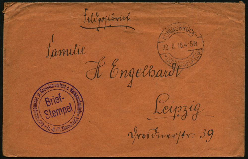 217 | 15 € | TRUPPENÜBUNGSPLÄTZE bis 1918 : KÖNIGSBRÜCK-/ *ÜBUNGSPLATZ/ a 1916 (29.8.) 1K-Brücke = Hauspostamt Truppenübungsplatz + viol. 2K-HdN: Ausbil-dungskursus mit Granatwerfern u. Nahkampfmitteln.. , rs. hs. Abs.: "Pionier Lehr-Kdo.", klar gest. Feldpost-Bf. n. Leipzig | ![]() | |